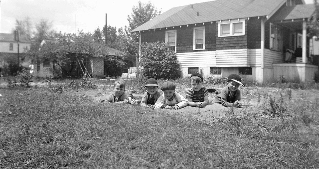 The lot next door to us was vacant for a while before the Harris family moved in. Below is a famous family photo of a bunch of ruffians, my brothers included, in a fox hole. Our Uncle Dick saw the kids struggling to dig the hole so he got a big shovel and helped dig it at an awe inspiring pace. I wasn’t born yet.